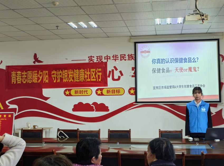 讲座现场座无虚席,朝阳社区的老年人纷纷赶来聆听。老员工创意食品工艺协会的成员们精心准备了内容丰富的讲解资料。从保健品的常见种类、功能作用到如何辨别真伪优劣,为老人们进行了详细的剖析。同时,还结合实际案例,深入浅出地讲解了一些因错误认知保健品而导致不良后果的情况,让老人们更加直观地认识到科学对待保健品的重要性。老人们认真聆听,不时提出自己关心的问题,现场互动频繁。此次讲座吸引了众多关注,安庆市电视台也到场进行了采访。食品科学与工程专业2023级(1)班徐玉湄表示:“我非常荣幸代表老员工创意食品工艺协会进行此次有关老年人科学认知保健食品以及健康饮食的讲座,希望可以让广大老年群众得到收获。”