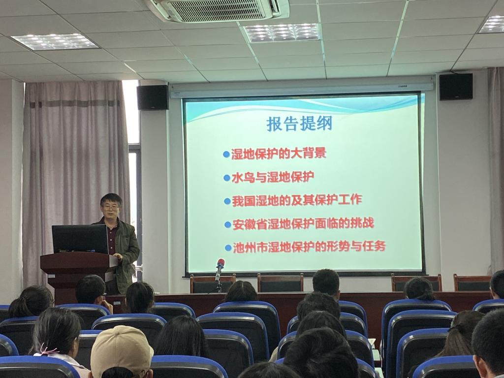 周教授就《安徽湿地保护修复模式的探索与实践》做了详细讲解。具体介绍了什么是湿地,湿地的类型和生态过程,湿地的重要性和保护,以及国际国内湿地保护大背景。报告还就安徽湿地的现状,深入探讨了安徽湿地保护面临的挑战和保护任务的艰巨性。报告结束后,公司与会师生与周教授就湿地保护问题进行了探讨和交流。(谈球吧 陈敏敏)