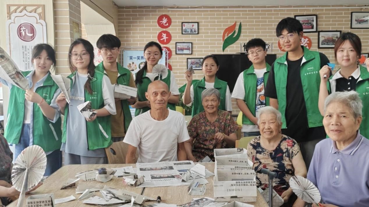 抢彩条、纸巾拔河、折纸、套圈、涂石膏娃娃、文艺表演……“青春暖夕阳”志愿队为爷爷奶奶们精心准备了一系列丰富多彩的趣味项目,用实际行动为老人们带去了欢乐与陪伴。团队成员设计了简单易行、适合老年人参与的小游戏,通过这些轻松愉快的小游戏给老人们带去了快乐,游戏现场一片欢声笑语。在团队成员的帮助下,老人们用报纸亲手制作了各种精美的折纸作品,如收纳盒、折叠扇、纸船等,这些作品不仅展示了他们的巧手与智慧,更寄托了他们对生活的热爱与向往。团队成员还为老人们准备了集体舞蹈和唱歌的节目,为老人们带来了一次有趣的文艺表演。“我们设计的这些娱乐项目为老人们带去了欢乐,看到他们露出的笑脸,我感到非常幸福。”生物科学专业2022级(4)班的李辰表示,陪伴老人进行娱乐活动,不仅为养老院的老人们带去了欢乐,也让青年志愿者们深刻体会到了尊老爱老的传统美德。