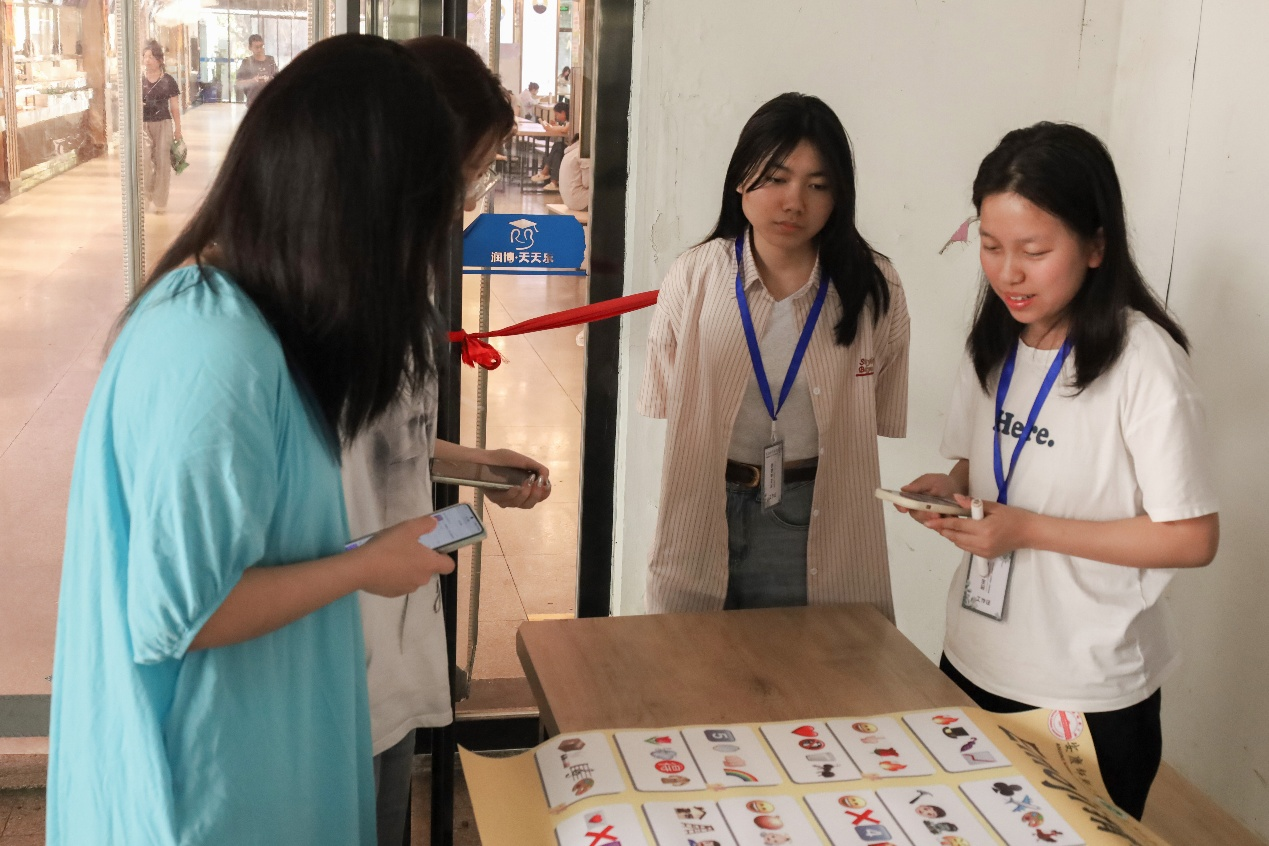 生物科学类专业2024(2)班的赵蕾在笑脸、向上指的手、玫瑰和火焰这个心情宫格前驻足良久。“笑上玫红是什么呢?”她疑惑地问。“笑脸是喜悦的心情,火焰正在燃烧,可以往这个方向猜测。”工作人员、生物科学类专业2024(4)班的方雅丽轻声提示。“是喜上眉梢!”赵蕾表示,虽然她的答题之路不是很顺畅,但当她成功猜出这个成语时,喜上眉梢就是她的心情缩影。