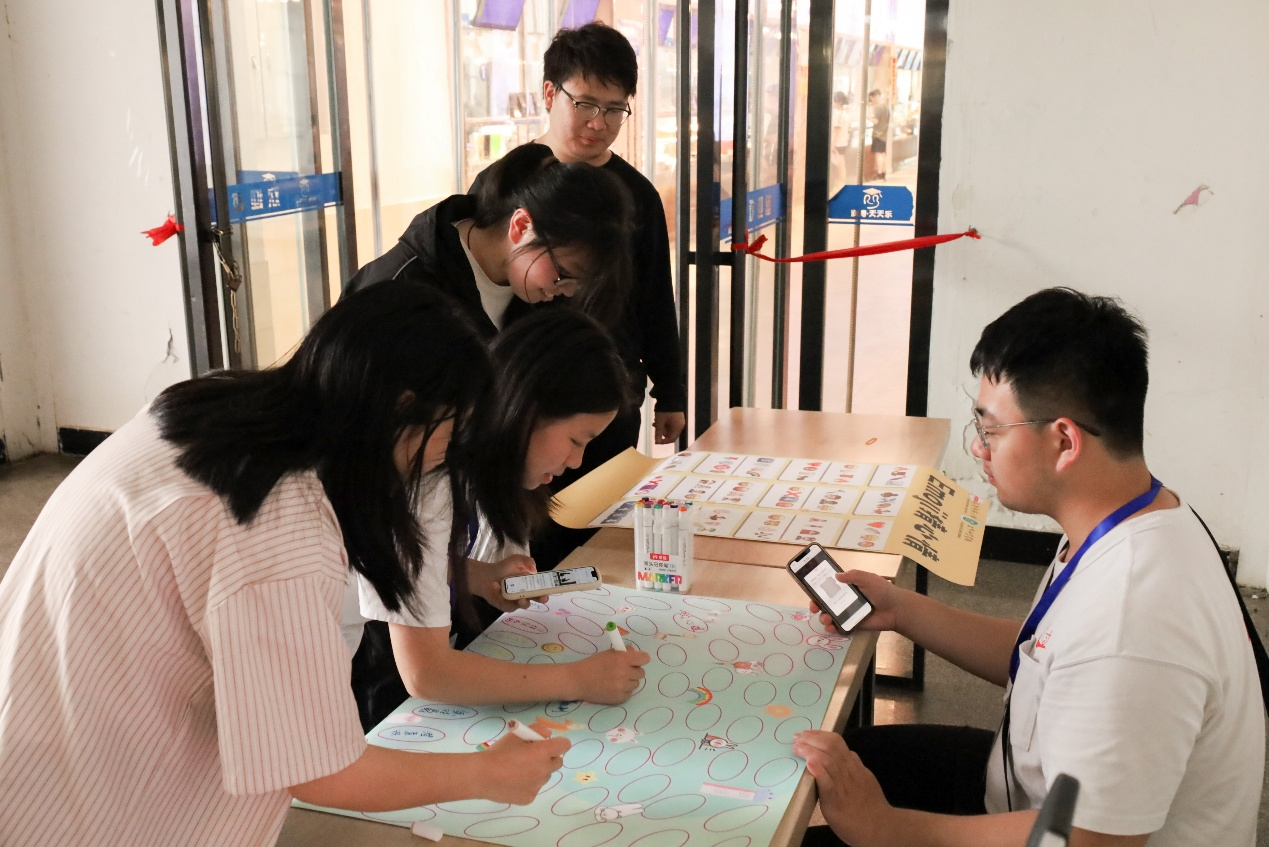 东苑食堂门口,工作人员、生物科学类专业2024(2)班的吴俊翔正在将精心准备的活动海报摆在桌子上。左侧海报上,由天使翅膀、咧嘴笑脸、椰树岛屿、雨伞符号等组成的九宫格引人驻足;右侧“我的幸福泡泡”海报则漂浮着无数彩色泡泡的剪影。“员工们可以通过观察表情九宫格,回答出三个心情宫格,将它们连成一条线,同时还可以在‘我的幸福泡泡’这张海报上写下自己了解的心理学名词。”他表示,后续这张写满心理学名词的海报将会被放在谈球吧大厅进行展示,用来宣传心理学知识。