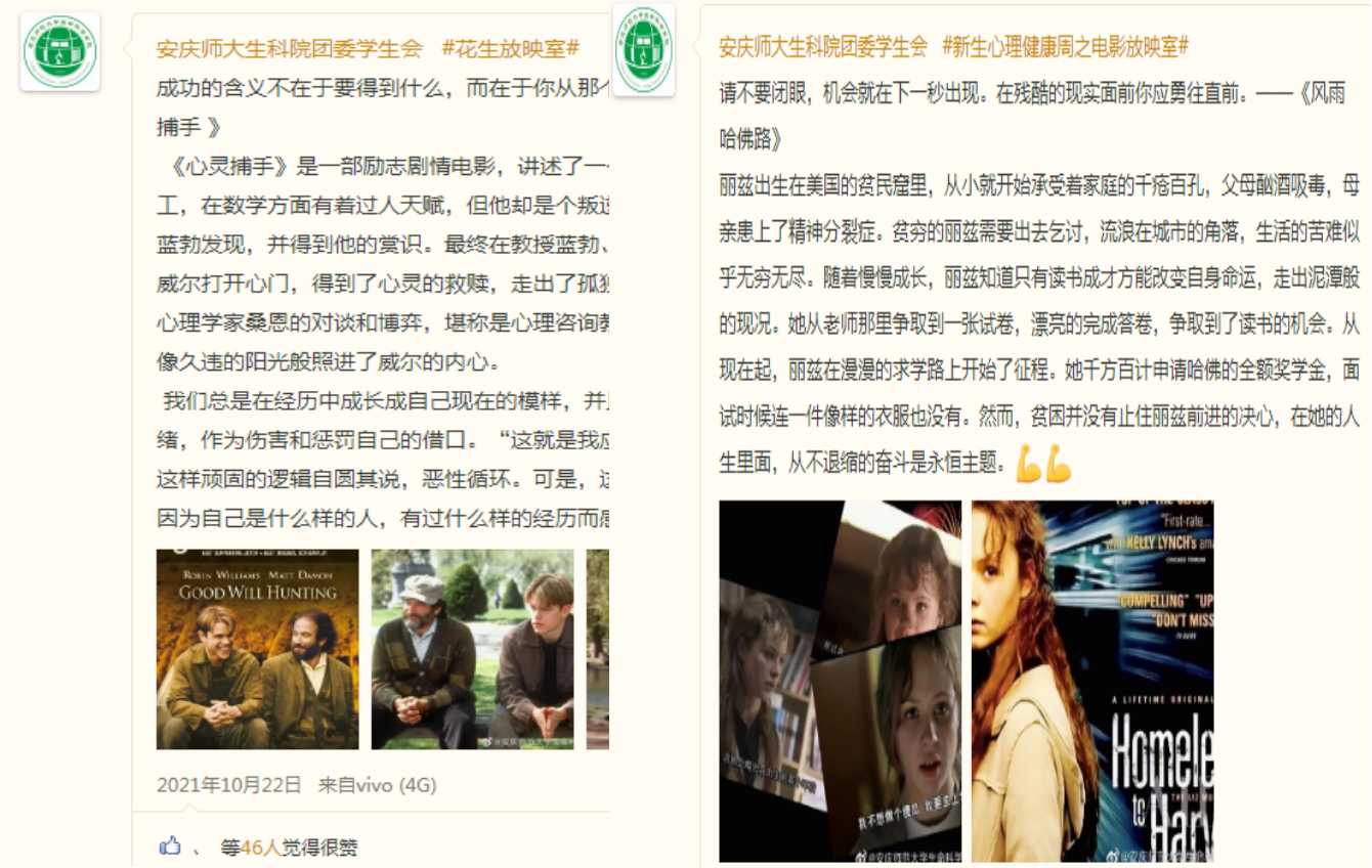 在心理健康周期间,谈球吧团委员工会官方QQ在活动期间每天推荐一部与心理健康相关的电影,分享的影片有《心灵捕手》、《心灵奇旅》、《风雨哈佛路》和《凯蒂和爷爷》等等。通过介绍影片内容,宣传心理健康知识。