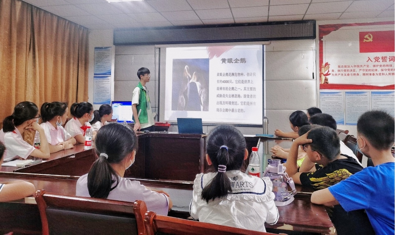团队成员为社区小朋友们准备了丰富的宣讲内容。从生物种类、生物与人类、保护生物多样性三方面讲解了生物多样性相关知识。讲解员从大家熟知的新冠病毒引入,介绍了五大类微生物、微生物的感染与防治、生活中的微生物。尤其在讲到微生物在果酒、腐乳及在人体肠道中的作用时,小朋友们听得非常入神,纷纷表示没想到小小的微生物有这么大的作用。在讲到鸟类时,视频中鸟漂亮的羽毛,优美的飞行姿态,也让小朋友们目不转睛。