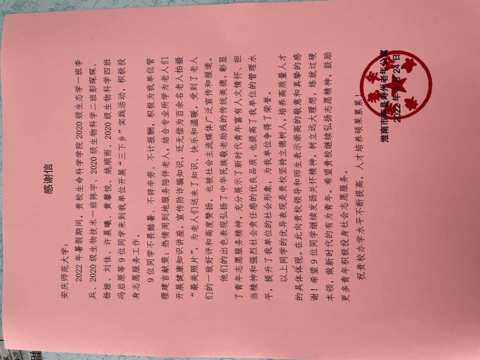 “9位同学不畏酷暑、不辞辛劳、不计报酬,积极为我单位管理建言献策;热情周到地服务陪伴老人……”8月24日,谈球吧暑期“三下乡”敬老爱老社会实践团收到了一封来自淮南市寿县寿州老年公寓百位老人寄来的感谢信,包含了对青年员工的认可与鼓励。