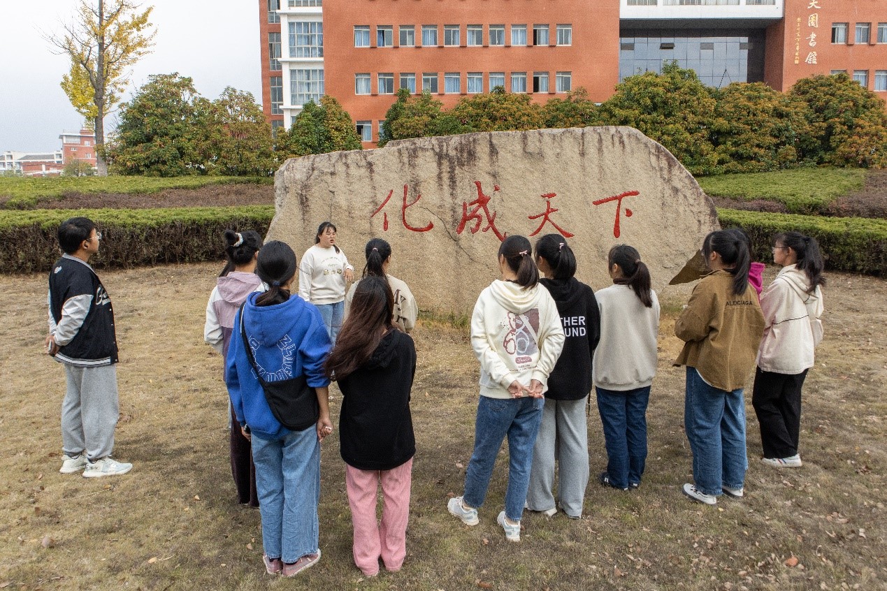 从谈球吧出发,到音乐厅结束,生物技术专业2021(1)班的胡勤化身为“小老师”,将讲解与提问相结合,帮助新生记忆沿途植物特点。由于路线经过图书馆,她还特意讲解石碑题字“化成天下”含义,以激励新生努力学习。“和大家一起学习非常有趣,我很享受向学弟学妹讲解植物知识的过程。”