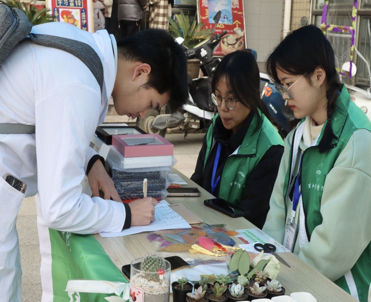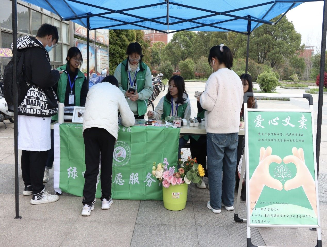 告知绿植养护方法、帮助员工包装鲜花……生物科学类专业2022(5)班的刘冰洁为购买员工提供着服务。从上周制作叶脉书签到开展爱心义卖活动,她全程“跟踪”活动,下周三还将和志愿队一起前往至爱家园看望孩子。“很期待见到孩子们的那一刻,我可以把礼物递到他们手中。”