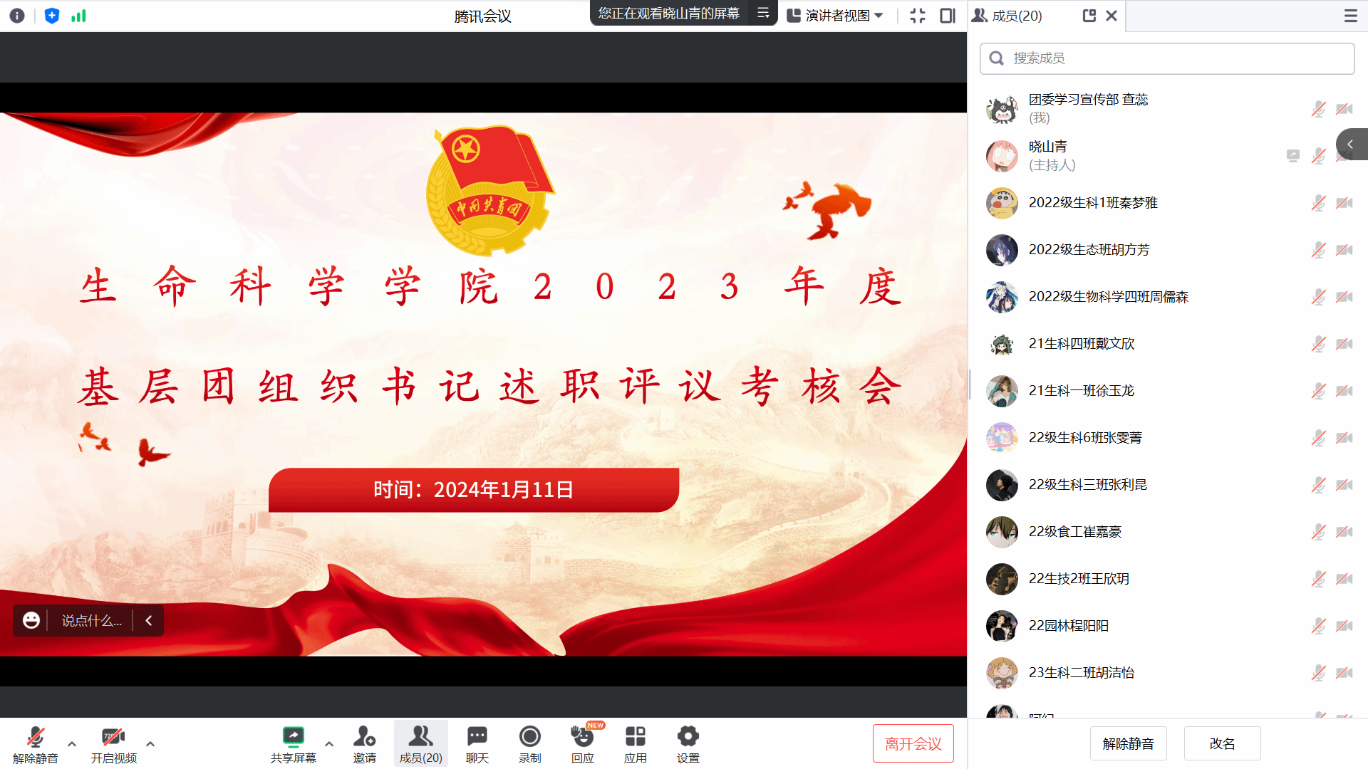 1月11日,谈球吧在线上召开2023年度基层团组织书记述职评议考核会,对2022级各班团支部进行现场述职考核,进一步推动基层团组织的组织力、引领力、服务力和大局贡献度协同提升,各班团支书及团委负责人徐启凤参加会议。