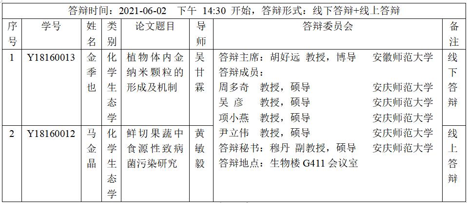 谈球吧2021届化员工态学硕士研究生学位论文答辩安排表