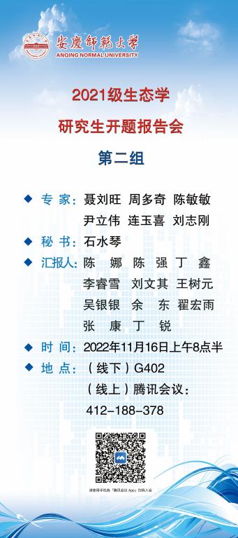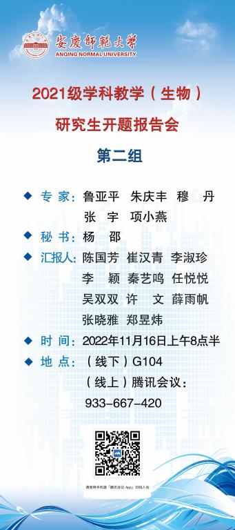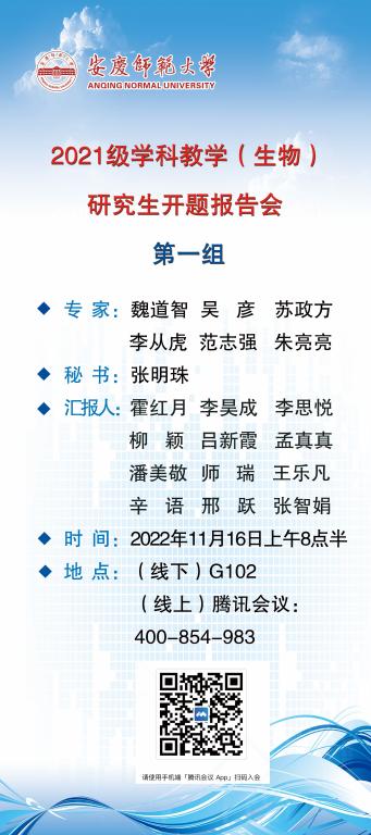 拟邀请安徽农业大学蔡永萍教授和安徽师范大学聂刘旺教授担任生态学专业专家组组长,邀请福建农林大学魏道智教授和安徽师范大学鲁亚平教授担任学科教学(生物)专业专家组组长。请2021级生态学及学科教学专业研究生准时参加